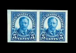 393 nh 557a image#557a, 5c Dark blue, imperforate, gem mint horizontal pair of this rare and seldom offered imperforate error, with only 50 pairs known, huge margins all around, bright and fresh, o.g., n.h., extremely fine; among the very few existing never hinged pairs; 2002 PF certificate. (Image) 2,350.00