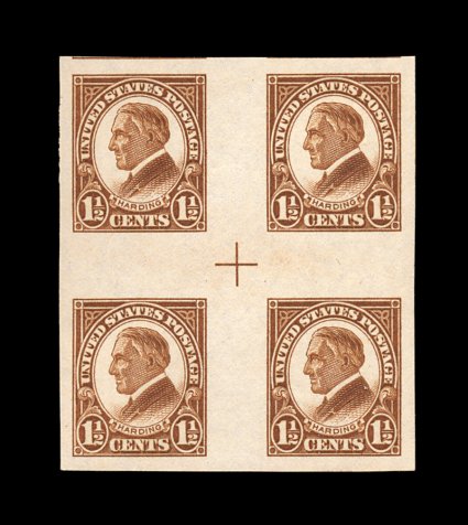 395 nhbl 631 var. image#631 var., 1 1/2c Yellow brown, without gum breaker ridges, a very scarce crossed gutter block of four, with crossed dashes as well, huge perfectly balanced margins all around, fresh, o.g., n.h., extremely fine; one of the most elusive varieties of the 20th century; 2003 PF certificate. (Image) 1,250.00