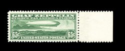 400 nh C13 image#C13, 65c Graf Zeppelin, right sheet-margin example, precisely centered within unusually large margins, brilliantly fresh, immaculate o.g. without the usual gum bends or skips, an extremely fine gem; 2002 PSE certificate for a block of four, this being the bottom right stamp. (Image) 350.00