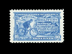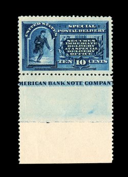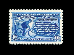 404 nh E9a image#E9a, 10c Blue, flawlessly centered amid exceptionally large margins, strikingly intense color and a prooflike impression on immaculate paper, unusually even and intact perforations for a perf. 10 stamp, pristine o.g., n.h., extremely fine; an eye-arresting gem example of this distinctive shade variety; 2003 PF certificate for a vertical pair, this being the top stamp. (Image) 425.00