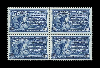406 nhbl E11 var. image#E11 var., 10c Ultramarine, "pink back", a brilliantly fresh mint block of four of this distinctive variety, with each stamp in the block being incredibly well centered within very large margins, sumptuously rich color, pristine o.g., n.h., extremely fine; handsome block containing four gem singles; 2002 PF certificate. (Image) as singles 160.00+