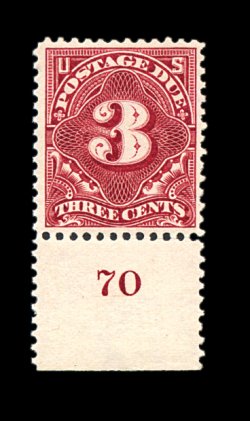 408 nh J40 image#J40, 3c Deep claret, bottom margin plate no. 70 single, brilliantly fresh, deep rich color, well centered, o.g., n.h., choice very fine; 2000 PF certificate for a strip of three, this being the right stamp. (Image) 145.00