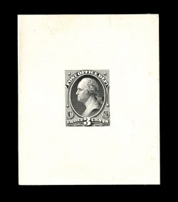 414 E O49e-4c image#O49E-4c, 3c Post Office Dept. "Washington" large die essay in black on white ivory paper, with vignette of Washington rather than the issued design with large numeral "3", measuring 64x67mm, quite fresh, insignificant thin spot in top right corner, still extremely fine; a rare and seldom seen official essay. (Image) 1,500.00