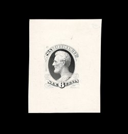 417 E O50-E1 image#O50-E1, 6c Post Office Dept., incomplete "Lincoln" large die essay in black on white ivory paper, an incredibly handsome essay featuring an incomplete engraving of a Lincoln vignette without rectangular frame design, measuring 41x54mm, trivial small corner thin of little consequence, very fine; a highly important and rare essay for the Official or Lincoln related specialist. (Image) 2,250.00