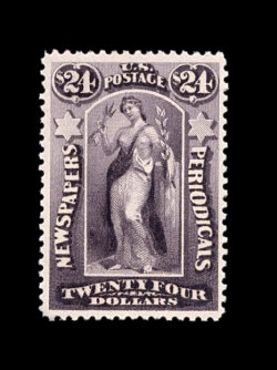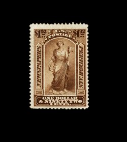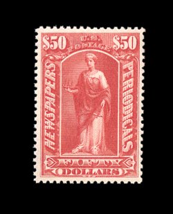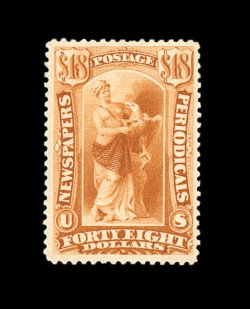 425 og PR54 image#PR54, $36.00 Brown rose special printing, without gum as issued, well centered, lovely rich and distinctive color, razor-sharp impression on hard white special printing paper, full intact perforations, trivial small thin spot of little consequence considering this stamp's unique status, very fine. The Special Printings produced by the Post Office Department in 1875 are among the greatest rarities in United States philately. These Special Printings, essentially for the purpose of having a complete display of all U.S. postal issues at the Centennial Exposition of 1876, were printed in extremely limited quantities. This is especially true of the 1875 Newspaper issues, and even more so for the four highest denomination stamps - the $24.00, $36.00, $48.00 and $60.00 values - all of which were printed in quantities of 100 each. However, Post Office Department records confirm that only two each of the $24.00 and $36.00 values, and one each of the $48.00 and $60.00 values were ever sold, with the remaining stamps having been destroyed. Thus, these high-value Newspaper Special Printings rank among the most elusive and important rarities known. In the case of the $36.00 value, while two were sold, only the example offered here has ever come to light and is the only copy certified as a genuine Special Printing by both the Philatelic Foundation and Professional Stamp Experts. This stunning and unique rarity has never appeared in a public auction sale. Hence, it has remained unpriced in the Scott catalog for years. To aid potential bidders as to this stamp's current market value we have a few facts that are of help in determining relative value. For instance, the Twelve Dollar Newspaper Special Printing (Scott #PR52), of which there are five confirmed copies, is priced in the latest edition of the Scott catalog at $75,000.00. Rarer yet is the Nine Dollar Newspaper Special Printing (Scott #PR51) of which only four copies were originally sold, and like the $36.00 offered here it is unpriced in Scott. Fortunately an example certified by the Philatelic Foundation was recently sold in the October 2002 auction of the Drucker Family Collection conducted by Robert A. Siegel Auction Galleries, Inc. giving bidders some insight as to the market value of these immense Special Printing rarities. It realized $115,500.00 (including premium) after very competitive bidding. Given that there were four copies sold of the Nine Dollar value and only two of the Thirty Six Dollar - with this being the only certified example - we feel our pre-sale estimate may prove to be conservative. Accompanied by 2002 PF and PSE certificates. (Image) Est. 100,000-150,000