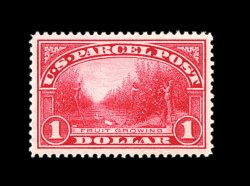 431 nh Q12 image#Q12, $1.00 Parcel Post, eye-arresting mint single, possessing flawless centering within large margins, but even more striking is this stamp's spectacularly intense "fiery" color and prooflike impression, pristine o.g., n.h., an extremely fine gem in every regard; 1983 and 2002 PF certificates for a block of four, this being the bottom right stamp. (Image) 750.00