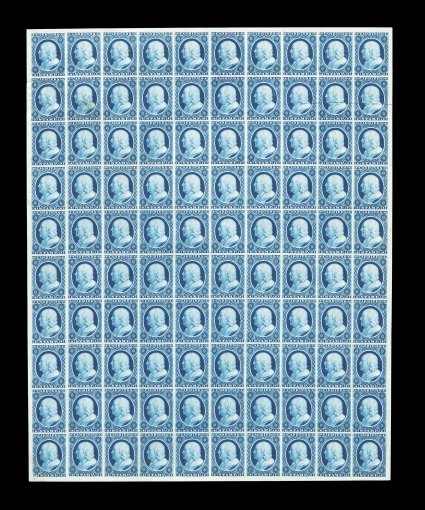 432 Pbl LO1P3, LO1P3 var. #LO1P3, LO1P3 var., (1c) Franklin Carrier, blue plate proof on India, a spectacular sheet 100, with nearly full sheet selvages all around, in addition to being the only intact proof sheet with which we are aware, this impressive sheet also displays the highly desirable and prominent plate crack found in positions 17-20L, marvelously fresh and bright, some minor paper bends and wrinkles throughout (mild horizontal crease in fifth row), repaired tear in positions 11-12L, well clear of the important portion of the sheet with the plate crack, overall very fine; this sheet catalogs as twenty five blocks of four at $4,125.00, without any premium for its obvious rarity as a full sheet, and does not take into consideration the plate crack portion of the sheet; an India plate proof block of eight (4x2) containing the same plate crack realized $4,000.00, plus the 10% buyer's premium, in the November 1999 sale of the impressive David Golden collection of Carriers and Locals; an outstanding exhibition item. (Image) Est. 3,000-4,000