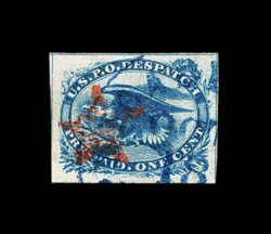 433 O LO2 image#LO2, 1c Blue Eagle carrier, gorgeous used single, large margins all around, including showing portions of dividing lines on three sides, beautifully postmarked by both a red star cancel and a scarce blue town (Philadelphia) c.d.s., extremely fine. (Image) 150.00