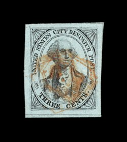 434 O 6LB3 image#6LB3, United States City Despatch Post, New York, N.Y., 3c Black on light blue, gem used example, possessing four large margins, with portions or traces of dividing lines on all sides, wonderfully fresh and bright, light central strike of a red "U.S." in octagon cancel, extremely fine; 1993 PF certificate. (Image) 500.00