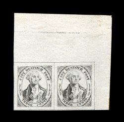 435 nh 40L1 image#40L1, City Despatch Post 3c Black on grayish, a showpiece top right corner sheet-margin horizontal pair of this classic stamp, boasting enormous margins, including huge sheet margins, as well as lavish margins elsewhere allowing complete dividing lines to show on all four sides, brilliantly fresh and crisp, prooflike color and impression, full o.g., stamps never hinged (hinged only in very top of sheet margin), a superb mint pair of the first adhesive stamp ever used in the United States; 2002 PF certificate. (Image) for hinged 850.00