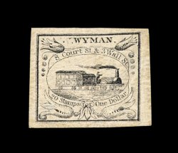 438 og 149L1 image#149L1, W. Wyman, Boston, Mass., 5c Black, a very scarce mint example of this elusive local, being the first stamp in the world to depict a train, four huge margins, o.g., some tiny thins, otherwise extremely fine; listed but unpriced mint in Scott; 1998 PF certificate. (Image) for used 750.00