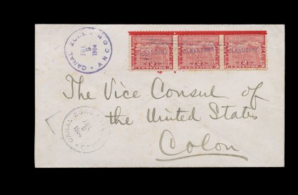 481 c 1 image#1, 2c Rose, horizontal strip of three, positions 55-57, tied by Ancon July 9, 1904 machine cancel on cover to the Vice Consul of the United States at Colon, Cristobal transit c.d.s. on the same day as sent, Colon backstamp on July 11, wonderfully fresh and very fine; signed J.C. Perry and accompanied by a 1993 PF certificate ex-Plass (CZSG #1). (Image) Est. 750-1,000