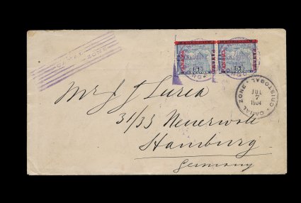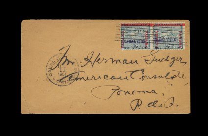 484 c 2 image#2, 5c Blue, horizontal pair tied by seven-bar cancel on cover to American Consulate in Panama, "Ancon/Canal Zone/Jul 13 1904" c.d.s. on reverse, Cristobal July 13 c.d.s. on front, Panama receiving backstamp, cover with insignificant tears at left, very fine; signed J.C. Perry (CZSG #2). (Image) Est. 300-400