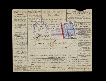 483 c 2 image#2, 5c Blue, position 100, with natural s.e. and partial arrow at bottom, tied by "Ancon/Canal Zone/Jul 8 1904" duplex pmk. on a spectacular all-over (front and back) advertising cover, incorporating many different advertisements on one cover (33 different advertisements on the reverse), sent to Panama (backstamped), cover with small bit out of top right and a small portion of the backflap missing, still very fine and one of the most impressive usages of any first issue cover; one of only two recorded first issue advertising covers; signed H. Bloch and accompanied by a 1979 RPS certificate; ex-Helme (CZSG #2). (Image) Est. 1,000-1,500