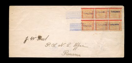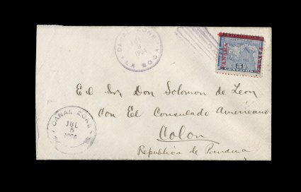 485 c 2 var. image#2 var., without "Canal Zone" overprint, single stamp tied by "La Boca/Canal Zone/ Jul 3 1904" duplex on cover to Colon, with July 5 receiver, fine; accompanied by a handwritten Sept. 30, 1904 letter from J.C. Perry to H.F. Colman which reads: "Dear Mr. Colman: The 2 - 5c - without surcharge Canal Zone, are the errors that occurred in two sheets - unfortunately my agent did not notice the error & broke the pair - I want 3.00 each for them - I have no others - Truly yours J.C. Perry"; Perry was responsible for finding many of the first issue errors and sending many of the known covers (including first day covers). This cover is addressed to his agent at the American Consulate in Colon. While this is not in the traditional format of the overprint omitted error (pair, with and without overprint), of which only four examples are known, we feel confident that this is a legitimate usage of the "without overprint" error; ex-Helme (CZSG #2 var.). (Image) Est. 750-1,000
