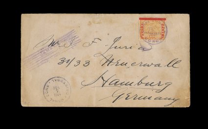486 c 3 image#3, 10c Yellow, nicely centered single tied by "Gordona Jul 7, 1904" c.d.s. on cover to Hamburg, Germany, Cristobal July 7 c.d.s. at bottom left, "Transito Colon" flag duplex on reverse, New York and Hamburg backstamps, cover with some minor age wear, stamp is very fine; only eleven covers recorded from Gorgona; ex-Brad Wilde (CZSG #3). (Image) Est. 300-400