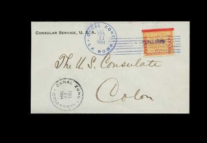 487 c 3 image#3, 10c Yellow, single tied by blue "La Boca/Canal Zone/Jul 11 1904" duplex postmark on cover to the U.S. Consulate in Colon, with "Consular Service, U.S.A." imprint at top left, Cristobal July 12 c.d.s. at bottom left, Colon Agency Target duplex on reverse, stamp and cover are exceptionally fresh, very fine and attractive; signed Bartels (CZSG #3). (Image) Est. 300-400