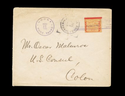 488 c 3 image#3, 10c Yellow, tied by "Ancon/Canal Zone/Jul 12 1904" duplex postmark on cover to U.S. Consul in Colon, Cristobal July 13 c.d.s. alongside, cover opened at left, fine; signed Bartels and accompanied by a 1985 APS certificate (CZSG #3). (Image) Est. 300-400