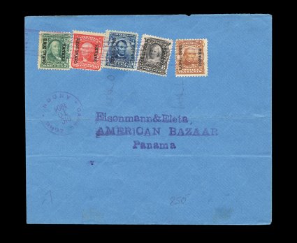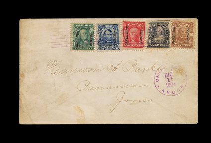 490 c 4-8 image#4-8, 1c-10c 1904 Overprints cplt., tied to one cover by "Ancon/Canal Zone/Dic 10 1904" duplex pmk., sent to Panama (backstamped), horizontal file folds not affecting stamps, fine; this series was removed from sale in the Canal Zone on the following day (CZSG #4-8). (Image) Est. 200-300