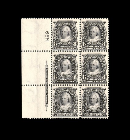 493 ogPB 7 image#7, 8c Violet black, full left margin imprint and plate no. 1499 block of six, intensely rich color on fresh paper, o.g., lightly hinged in the selvage, stamps unhinged but just slightly affected by tropicalization, a couple sensibly reinforced perfs. in the selvage, fine-very fine; a very rare plate block that only exists from the left and bottom positions, even the comprehensive Plass collection did not contain a plate block of the 8c value (CZSG #7). (Image) 3,000.00