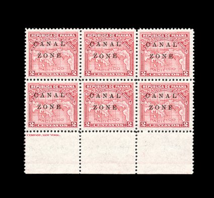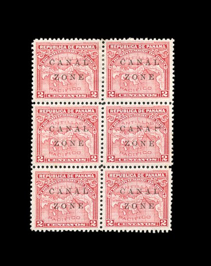 497 ogbl 10b #10b, 2c Rose, "L" of "Canal Zone" sideways, an impressive mint example of this rare and most unusual error, contained in a block of six (2x3), the error being the right stamp in the middle row, exceedingly fresh, well centered, o.g., error stamp lightly hinged, very fine; only 21 examples of this error have been recorded, with this particular copy being one of the more eye-appealing examples available; ex-Conger (CZSG #10b). (Image) 2,500.00+