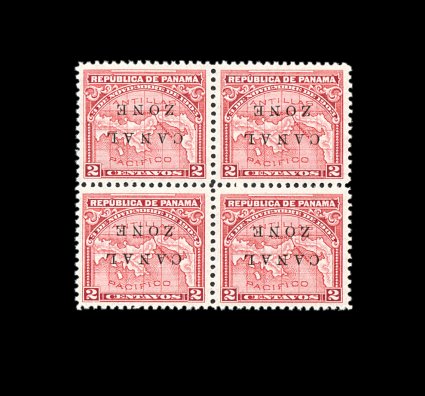 496 nhbl 10a image#10a, 2c Rose, inverted "Canal Zone", immaculate mint block of four, exceedingly well centered, gorgeous rich color on bright white paper, pristine o.g., never hinged, extremely fine; an especially handsome and choice block; it is estimated that only 240 inverted ovperprints were printed (CZSG #10a). (Image) for hinged 900.00+