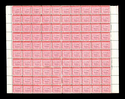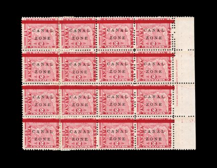 498 ogbl 11 #11, 2c Rose, full sheet of 100, with full selvage and imprints at right and left, includes several varieties such as the Scott listed antique "Zone" (#11a) at position 48, also "Panawa" (positions 24 and 29), 16mm "Panama" overprint (positions 25 and 30), broken "L" and "Z" (positions 42 and 32 respectively), and "Panama" 1.5mm below bar at positions 91 and 100, deep color, uncommonly well centered throughout, unusually fresh o.g., several hinge reinforcements, fine-very fine; nice multiple for the specialist (CZSG #11, 11a, 11.1, 11.2, 11.5). (Image) 1,062.50+
