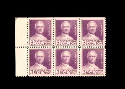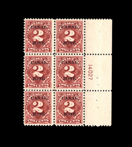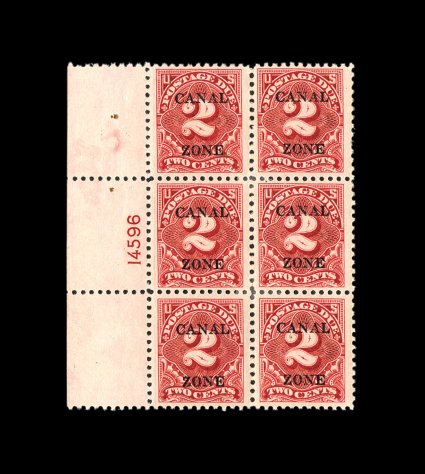 597 ogPB J19 image#J19 var., 2c Carmine rose, wrong font on "Canal", position 51, being the bottom left stamp in a left margin plate no. 14596 block of six, well centered, tropicalized o.g., slight hinge reinforcing, very fine; a seldom encountered variety that is particularly desirable within the plate block (CZSG #J19.1). (Image) Est. 400-500