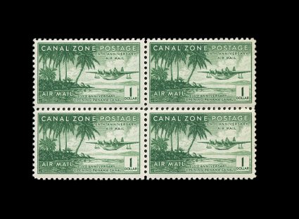 589 Obl CO8-12 image#CO8-12, 5c-40c Airpost officials, 17mm ovpt. cplt. in c.t.o. blocks of four, uncommonly well centered set of blocks, bright fresh colors, all still with o.g. and never hinged, very fine and choice set; although Scott gives only a small premium for blocks versus the price of four singles, blocks are almost never encountered, especially in complete sets (CZSG #CO8-12). (image 589a) (Image) 3,825.00