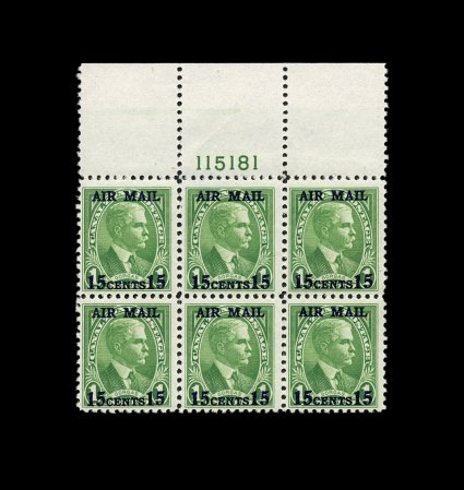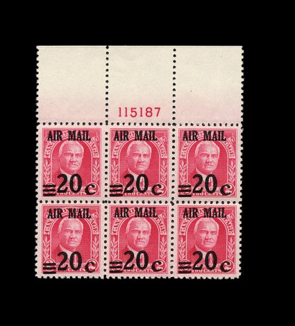 585 nhPB C5 image#C5, 20c on 2c Carmine air post, full top margin plate no. 115187 block of six, excellent centering, especially the top row, brilliantly rich color, crisp and intact, unblemished o.g., n.h., extremely fine and choice (CZSG #C5). (Image) for hinged 110.00