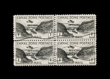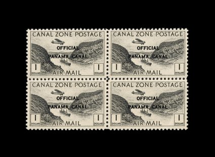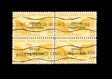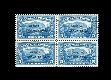 599 Obl O3 var. image#O3 var., 5c Blue official, with "O" of "Official" over "N" of "Panama", c.t.o. block of four, with the two top stamps being the variety, the bottom stamps are normal, fresh color, still with o.g. (n.h.), very fine; this variety occurred in positions 11-15 from the second printing (about 5% of all #O3's issued) (CZSG #O3.1a). (Image) Est. 150-200