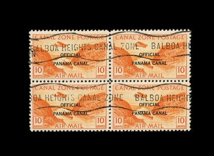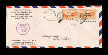 591 c CO9 image#CO9, 10c Orange air post official, 17mm overprint, horizontal pair from the top right corner of the sheet, with natural s.e.'s at top and right, tied by "Balboa Heights C.Z./Oct 10/1942" duplex pmks. on cover to Costa Rica (backstamped), Director of Posts corner imprint, magenta censor marking, opened at left, vertical file fold not affecting stamps or markings, fine; this is the scarcest of the air post officials, and is quite rare on cover; cataloged as an on cover plus an off cover stamp (CZSG #CO9). (Image) 675.00+