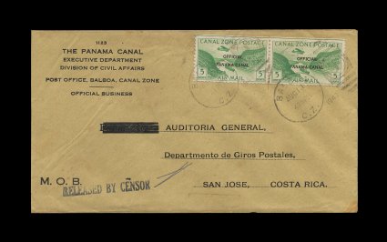 590 c CO8 image#CO8, 5c Yellow green air post official, 17mm overprint, horizontal pair with s.e. at top, tied by "Balboa Heights C.Z./Aug 13/1943" duplex pmks. on cover to Costa Rica (backstamped), Division of Civil Affairs corner imprint, straightline censor marking, opened at left, very fine and a very scarce usage; interestingly, the vast majority of the 17mm air post officials on cover have straight-edges on one or more sides, because the Canal Zone Philatelic Agency removed stamps from the outer edges for filling departmental requisitions before applying the c.t.o. postmarks (see next lot); cataloged as an on cover plus an off cover stamp (CZSG #CO8). (Image) 660.00+