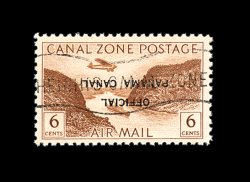 592 O CO14a image#CO14a, 6c Yellow brown air post official, inverted overprint, very well centered, fresh color, light roller c.t.o. cancel (as all known examples of this error have), still with original gum, very fine; a handsome example of this rare error, only one pane of 50 was sold; 1983 PF certificate; ex-Drucker (CZSG #CO14a). (Image) 2,500.00