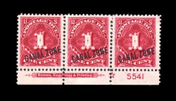 593 nh J1 image#J1, 1c Rose carmine, gem bottom margin imprint and plate no. 5541 strip of three, extraordinarily well centered within huge margins, intense color and impression, o.g., n.h., extremely fine; a remarkable quality plate number strip; ex-Drucker (CZSG #J1). (Image) as hinged sings 255.00