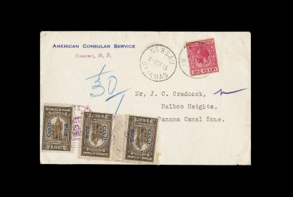 594 c J5 image#J5, 2c Olive brown, three singles tied by violet double circle "Balboa Heights/Canal Zone/Oct 21/1915" postmarks to each other and to cover from the American Consular Service in the Bahamas, franked with Bahamas 1p Carmine rose ((#50) tied by "Nassau/Bahamas/6 Oct 15" c.d.s., Balboa Heights backstamp, opening tear through flap only, very fine; seldom seen commercial postage due usage; ex-Helme (CZSG #J5). (Image) Est. 200-300