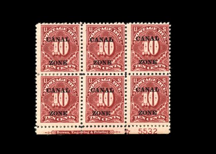 596 ogPB J14 image#J14, 10c Deep claret, bottom margin imprint, star and plate no. 5532 block of six, natural short selvage, deep rich color, tropicalized o.g. with some wax paper still adhering in a few places, a fine example of this enormously rare postage due plate block; ex-Wampler (CZSG #J14). (Image) 3,250.00