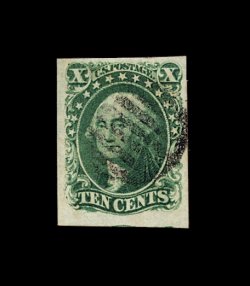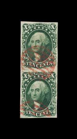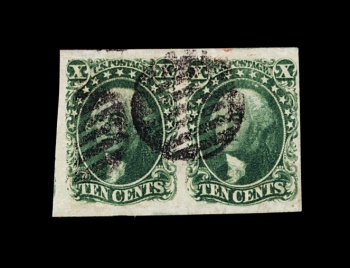 62 O 16 image#16, 10c Green, Ty. IV, positions 54-55L1, both recut at bottom, seldom seen used horizontal pair, featuring large to mostly enormous margins all around (with traces of three adjoining stamps showing), with the left stamp in the pair possessing perhaps the largest margins we have ever seen on a Ty. IV stamp, deep luxuriant color and a well incised impression, couple of neat strikes of circular grid cancels, extremely fine; multiples of the 1855 Ten Cent Type IV are extraordinarily rare; 1975 PF certificate; ex-Chapin. (Image) 4,250.00