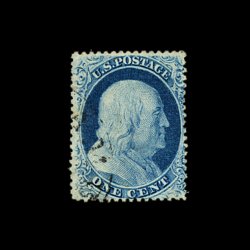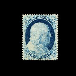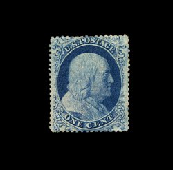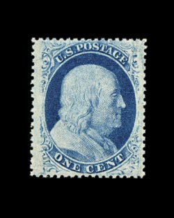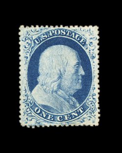 65 og 18 image#18, 1c Blue, Ty. I, incredibly well centered amid extravagantly large margins which are most uncharacteristic of this issue, intense color and impression often associated with plate 12 stamps, full o.g. which is just a bit disturbed (although no mention is made on the accompanying certificate), extremely fine; a handsome example of this very scarce mint stamp; clear 1982 PF certificate; ex-Chapin. (Image) 2,000.00