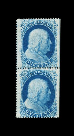 66 og 18, 20 image#18, 20, 1c Blue Ty. I and Ty. II combination pair, a mint vertical pair of this seldom seen combination, being from the right hand portion of the pane, with natural s.e. at right, extraordinarily wide margins to allow full center line to show, brilliantly fresh, bright color, well centered, full o.g., small central h.r. reinforcing a few separated perforations, a very fine and choice example of this exceedingly scarce combination pair; ex-Chapin. (Image) 3,400.00