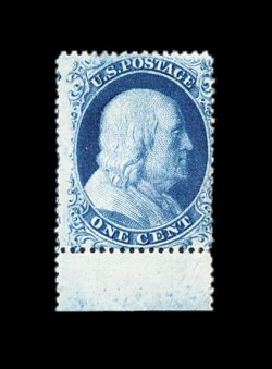 67 og 19 image#19, 1c Blue, Ty. Ia, an immensely rare mint example of this type, being a fresh bottom sheet-margin copy, with rich luxuriant color and a sharp detailed impression which shows the type characteristics quite clearly, centered slightly to right but not objectionably so, part o.g., mild diagonal crease and a small tear at top, neither of which affect the stamp's attractive appearance, a highly collectable example of one of the rarest stamps in U.S. philately to find mint; 1960 PF certificate; ex-Ishikawa. (Image) 25,000.00