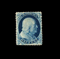 75 ng 22 image#22, 1c Blue, Ty. IIIa, Plate 11, unused, fabulously well centered amid truly immense margins for a perforated One Cent, with no portion of the design being impinged by its perforations, an almost impossible occurrence, rich luxuriant color and impression, an extremely fine and impressive gem; 2002 PF certificate. (Image) 900.00