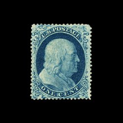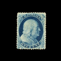 76 og 23 image#23, 1c Blue, Ty. IV, an incredibly handsome appearing mint example of one of the rarest and most challenging stamps of the 19th century to find in any kind of acceptable quality, possessing absolutely perfect centering (which is unheard of on this) within large margins, plus its color and impression could not be more prooflike on brilliantly fresh paper, full o.g. (another rare occurrence on this), lightly hinged, there are two light creases which in no way affect this stamp's superb overall appearance and are not even mentioned on the accompanying certificate, otherwise extremely fine; a stamp that is on virtually every mint collector's want list; clear 1971 Royal Philatelic Society certificate; ex-Chapin. (Image) 8,500.00
