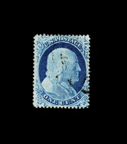 73 O 21 image#21, 1c Blue, Ty. III, position 99R2, an enormously rare used example of this famous position which shows the widest breaks possible at both top and bottom on any Ty. III stamp, quite well centered, rich color in a deep shade, clear impression showing the type characteristics well, very light face-free c.d.s. confined to bottom left corner, virtually free of the flaws which affect the majority of known copies, with only a small corner crease at top left almost unworthy of mention, very fine; one of the great rarities of classic U.S. stamps, as only one unused example is known (contained in a block of nine), and our records suggest there may be fewer than twelve used examples in existence; plated and signed by Stanley B. Ashbrook, as well as being accompanied by a 1995 PF certificate; ex-Chapin. (Image) 10,000.00