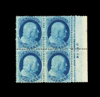80 ogPB 24 image#24, 1c Blue, Ty. V, handsome full right margin partial imprint and plate "No. 10.P." block of four, extraordinarily well centered throughout, bright fresh color and impression, full o.g., trivial facial rub at far edge of selvage, extremely fine; a very scarce plate number multiple; ex-Chapin. (Image) Est. 750-1,000