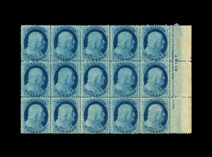 81 ogPB 24 image#24, 1c Blue, Ty. V, impressive full right margin partial imprint and plate "No. 10.P." block of fifteen (5x3), wonderfully fresh, bright color, outstanding centering, particularly for such a large multiple, pristine o.g., several stamps n.h., rest largely lightly hinged, couple of perf. separations in sheet selvage, very fine-extremely fine; a showpiece plate number multiple in exceptional condition; ex-Chapin. (Image) Est. 2,000-3,000