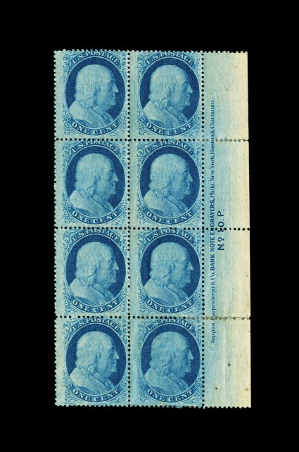 82 ogPB 24 #24, 1c Blue, Ty. V, full right margin imprint and plate "No. 10.P." block of eight, quite fresh, rich color, rather well centered, full o.g., couple of minor h.r.'s reinforcing some perf. separations (primarily in selvage), very fine for this scarce classic plate number block; 1970 PF certificate; ex-Chapin. (Image) 3,500.00