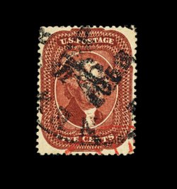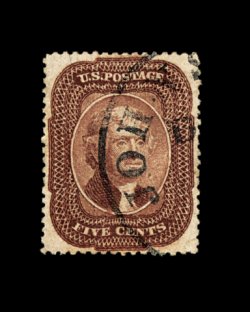 86 O 28A image#28A, 5c Indian red, Ty. I, an exceedingly handsome used example, possessing far better centering and much larger margins than typically associated with this rare and challenging stamp, sumptuously rich and unmistakable Indian red color, well incised impression on bright paper, boldly cancelled with a couple of strikes of a black c.d.s., as well as a portion of a red transit postmark, extremely fine; 1992 PSE and 1993 PF certificates; ex-Chapin. (Image) 3,075.00