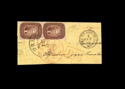 88 O 29 image#29, 5c Brown, Ty. I, well centered vertical pair tied to attractive small portion of yellow colored cover by both New Orleans town postmark (Sept. 1859) and Boston transit c.d.s., piece also showing French postal markings, pair with strong rich color, very fine. (Image) 750.00+