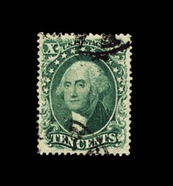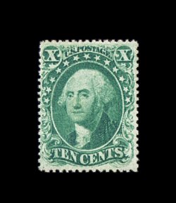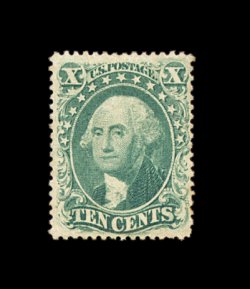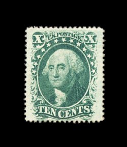91 og 31 image#31, 10c Green, Ty. I, a premier example of this enormously rare mint stamp, being one of the few premium quality original gum copies in existence, well centered within margins that are, for this type, exceptionally large and well balanced, clearly displaying the full bottom shells characteristic of this type, its color is especially deep and luxuriant, with its impression well etched, even and intact perforations all around, and adding to this stamp's list of impressive attributes is its full o.g. that has been relatively lightly hinged, extremely fine; an exciting opportunity for the serious collector of mint U.S. stamps to finally fill an impossibly difficult space in their album; 1992 PF certificate; ex-"Alford" Collection. (Image) 17,500.00